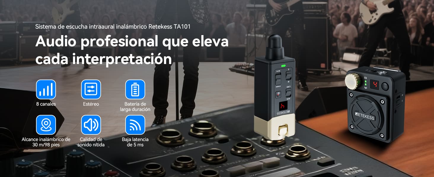 El sistema de monitorización inalámbrico intraaural Retekess TA101 es ideal para grandes escenarios, actuaciones solistas y ensayos con pequeñas bandas. A diferencia de otros sistemas inalámbricos mono, el TA101 utiliza un cable de 3,5 mm, lo que proporciona sonido estéreo al usarse con fuentes estéreo. Un solo transmisor admite varios receptores, y varios transmisores se pueden conectar a varios receptores, satisfaciendo así sus diversas necesidades