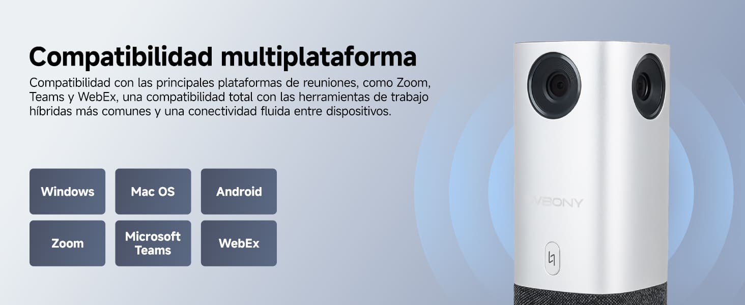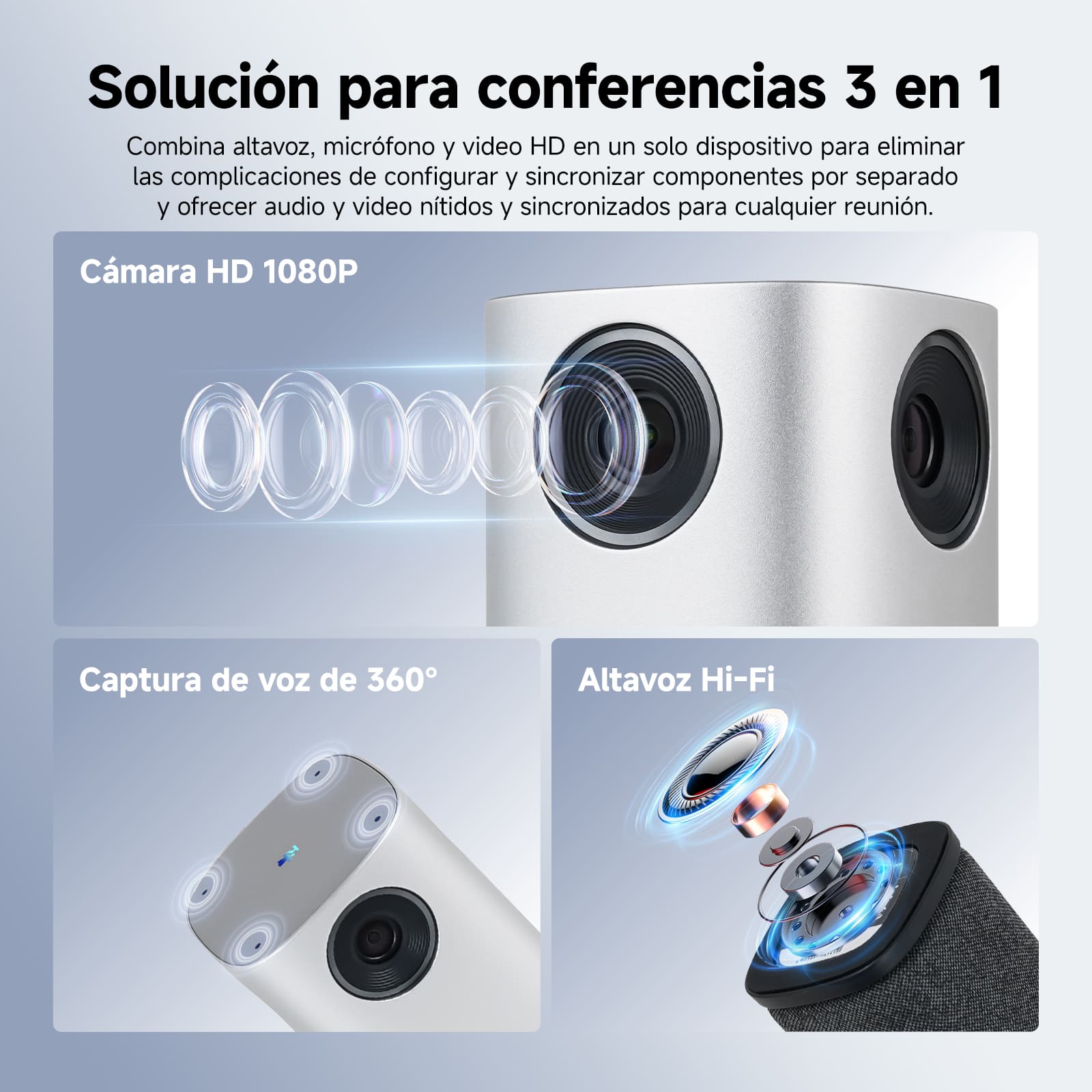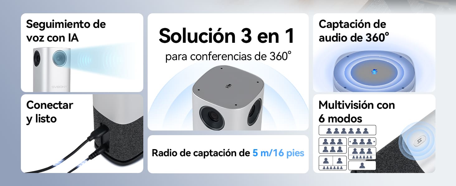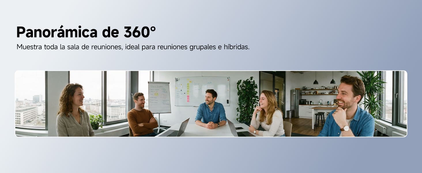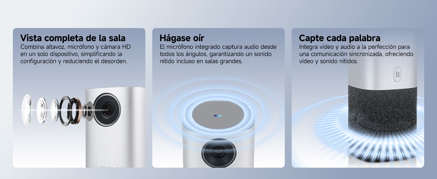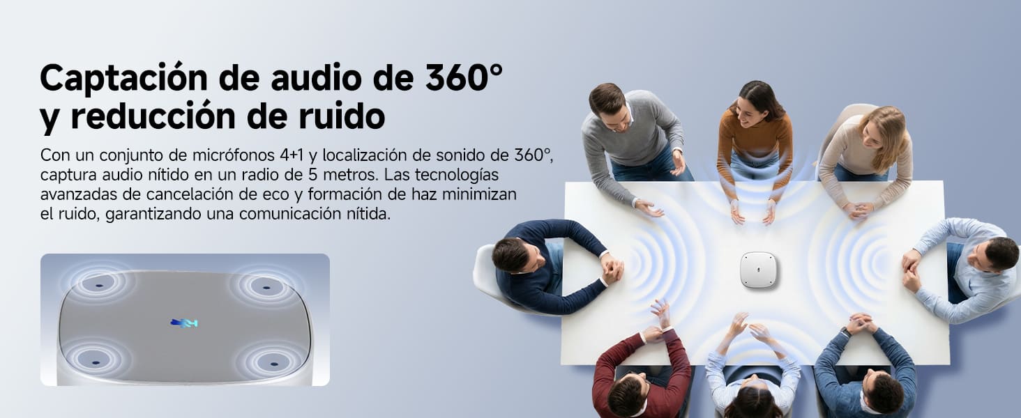 La cámara 360° para salas de conferencias integra captura de voz 360°, tecnología avanzada de reducción de ruido y altavoces estéreo, con un alcance efectivo de hasta 5 metros (16 pies). Un conjunto de 4+1 micrófonos captura la voz con precisión y minimiza el eco. La cancelación de eco y los altavoces estéreo ofrecen una experiencia de audio inmersiva de 360°.