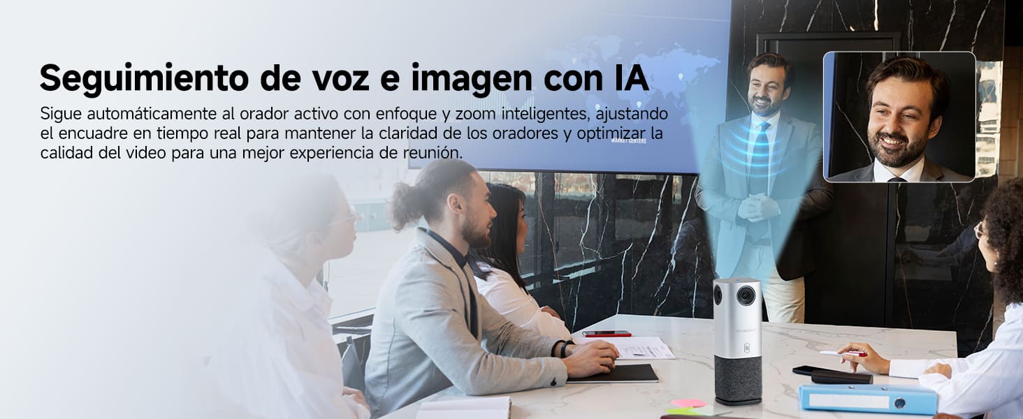 Seguimiento del orador con IA: Esta cámara para conferencias de 360° utiliza tecnología de posicionamiento de voz con IA y seguimiento de imagen para detectar la ubicación del orador en tiempo real, enfocarlo automáticamente y ajustar el enfoque y el encuadre automáticamente. El encuadre inteligente y la optimización de imagen garantizan una visibilidad clara para todos los oradores, creando una experiencia de reunión atractiva.