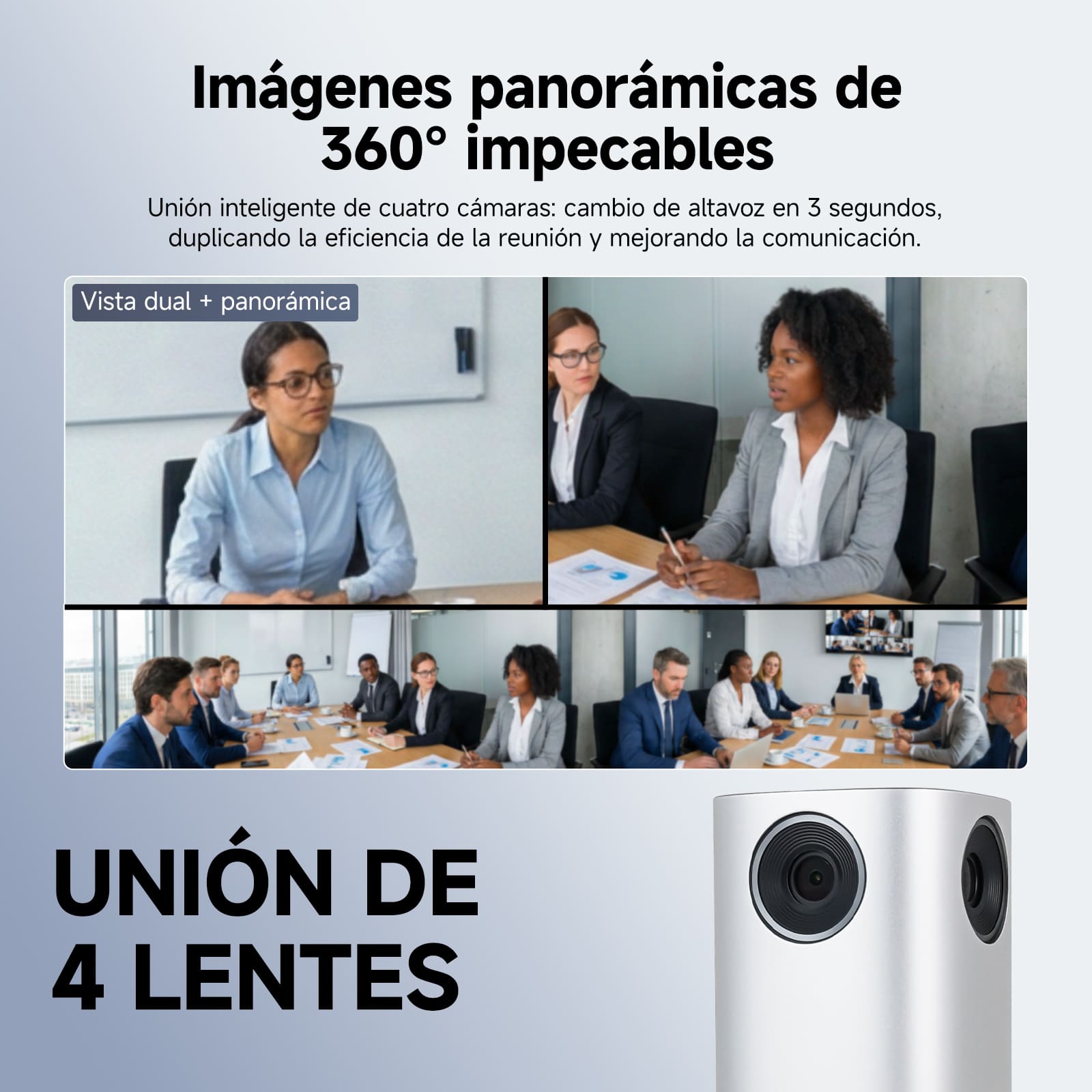 Unión inteligente de múltiples vistas: La tecnología avanzada de imágenes panorámicas de 360°, combinada con la unión inteligente de cuatro lentes y la conmutación dinámica de múltiples vistas, proporciona una perspectiva panorámica fluida, garantizando una visión clara para todos los participantes.