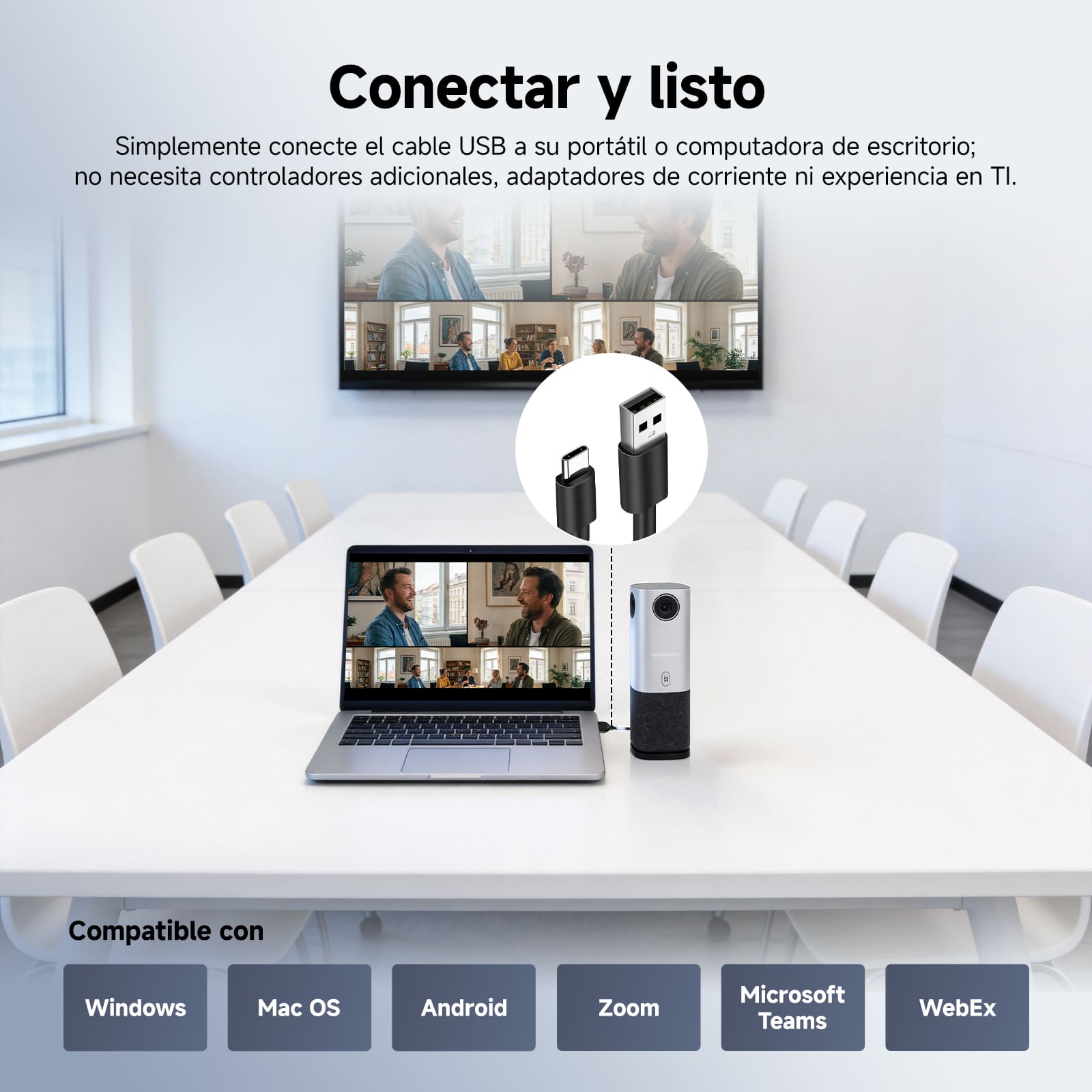 USB plug-and-play: Simplemente conéctelo y estará listo para usar; no requiere configuración. Esta versátil cámara web SVN A1 es compatible con sistemas Windows, Mac y Android, así como con múltiples plataformas como Zoom, Teams y WebEx, lo que garantiza una conectividad fluida para trabajo y reuniones híbridos.
