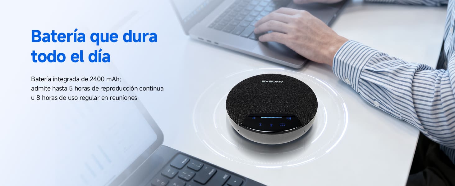 Una batería duradera de 2400 mAh proporciona hasta 5 horas de reproducción continua y 8 horas de uso normal, lo que garantiza una batería de sobra para su altavoz portátil para reuniones.