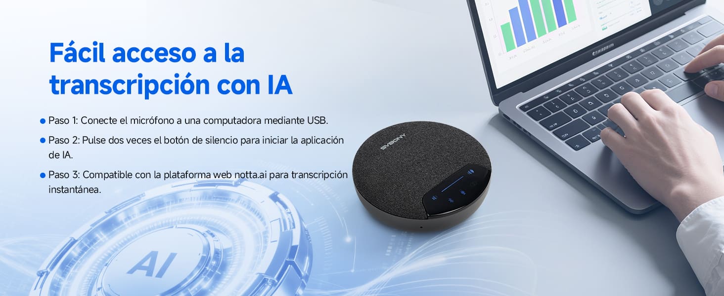 En modo USB, el botón de IA permite la transcripción y el resumen en tiempo real. Los accesos directos personalizables con un solo clic ayudan a garantizar una comunicación clara y eficiente en las reuniones, proporcionando una experiencia de micrófono más inteligente y personalizada.