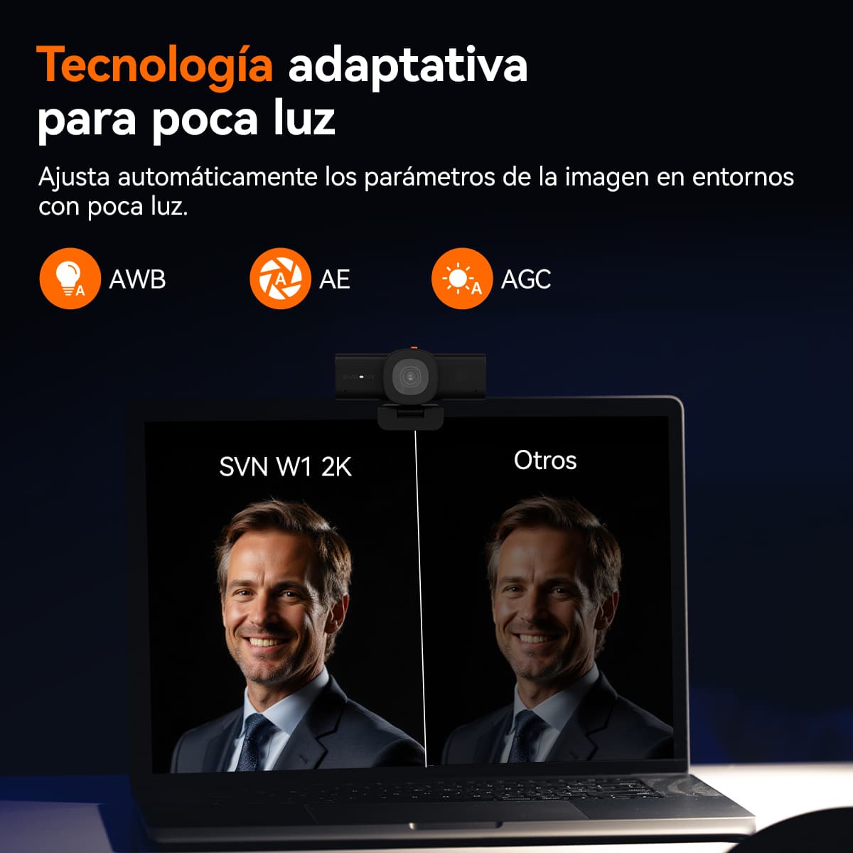 La cámara web SVN W1-2K admite AE; AWB; y AGC; optimizando automáticamente la configuración de la imagen en condiciones de poca luz para que pueda usarla de manera efectiva en cualquier momento.