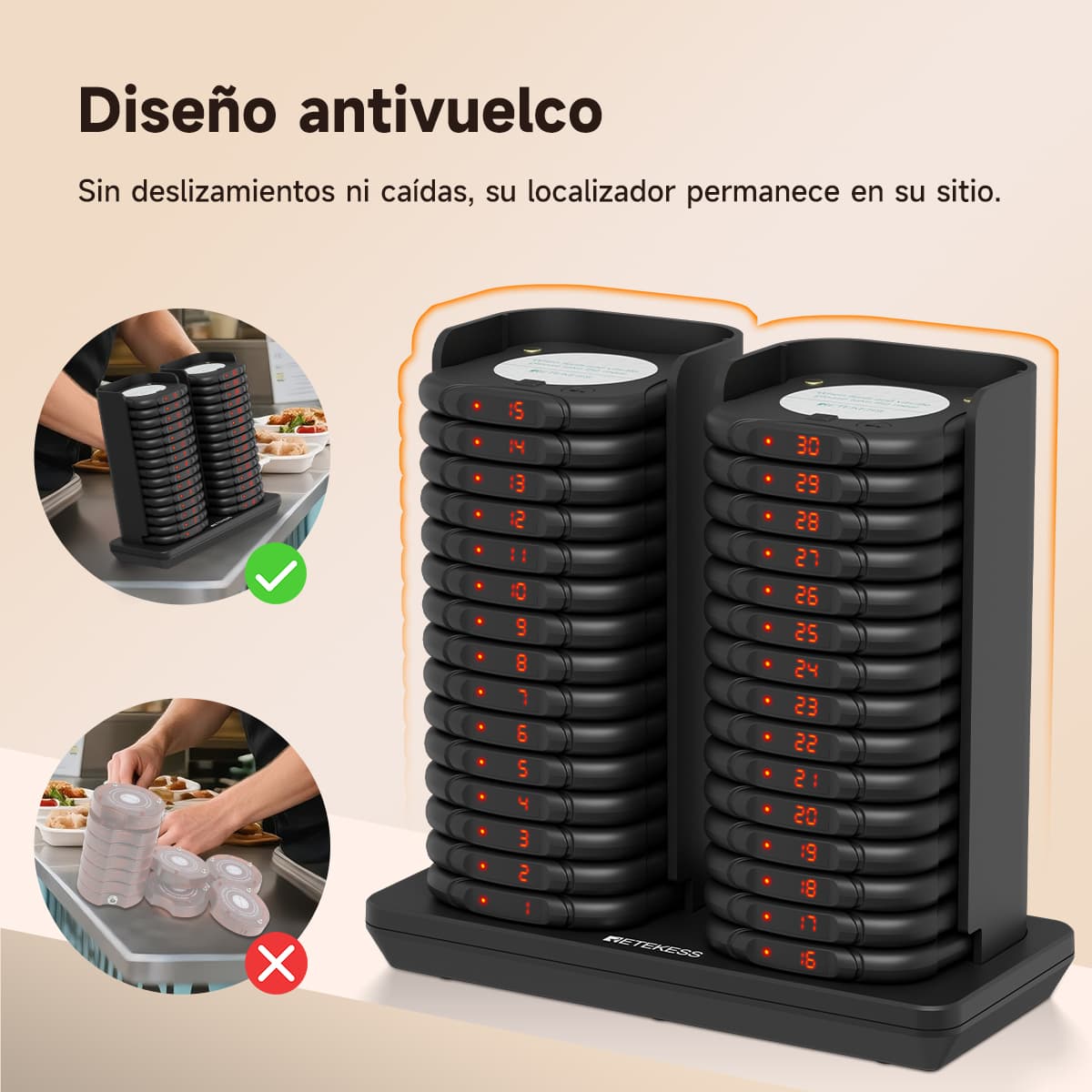 Protección contra el vuelco de los buscapersonas; los buscapersonas para restaurantes son estables y seguros cuando se apilan para cargarlos o almacenarlos; garantizando que no se vuelquen si las bandejas se recuperan desde arriba o se sacan desde abajo; proporcionando una colocación segura y estable