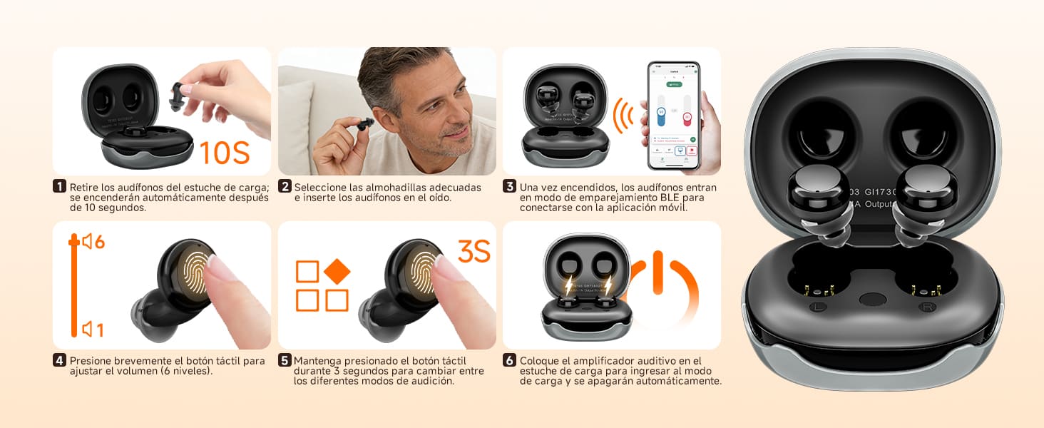 Este elegante audífono de venta libre tiene un tiempo de espera de 10 segundos tras el encendido, durante el cual puede ajustar el ángulo de colocación. También ofrecemos varios tamaños de tapones para garantizar un uso cómodo y evitar la retroalimentación incómoda causada por la entrada de aire en el canal auditivo.