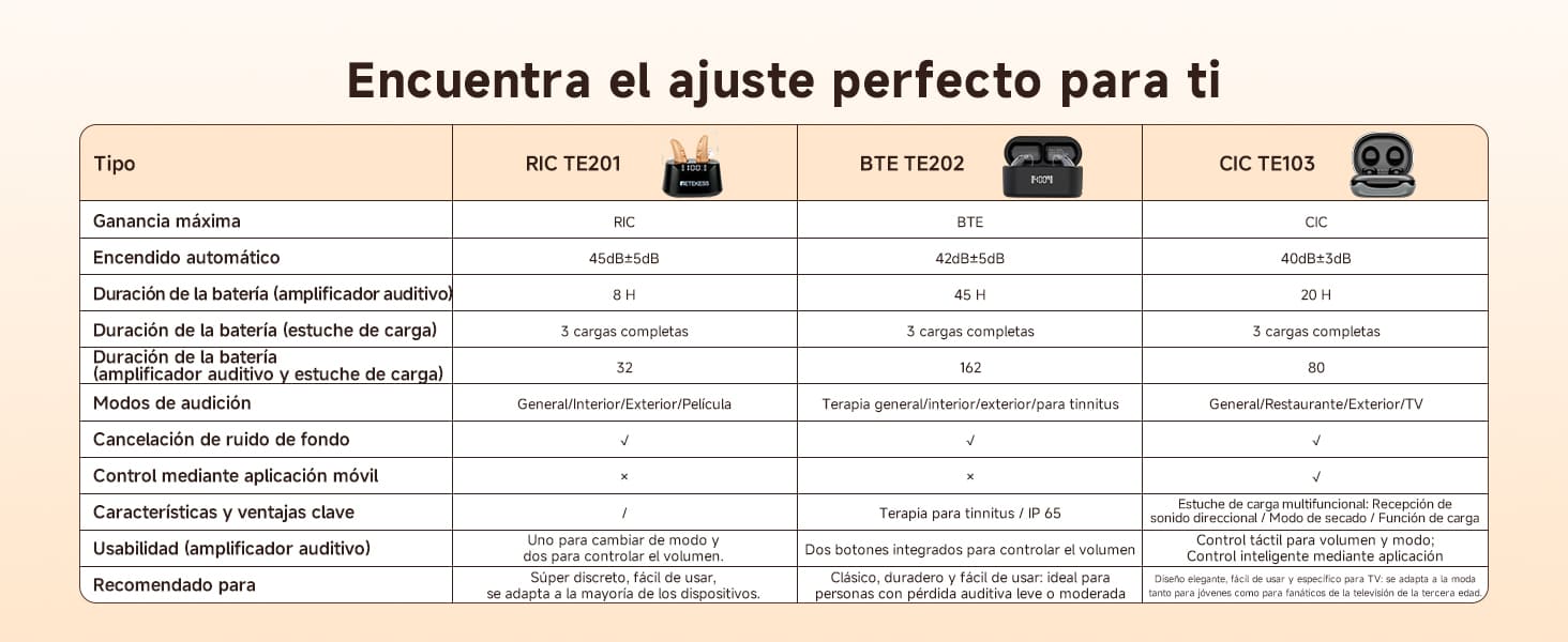 El audífono inteligente TE103 tiene una ganancia de 40 dB + 3 dB, ideal para personas con pérdida auditiva leve a moderada. El estuche de carga admite la captación de sonido direccional, lo que le permite colocarlo cerca de un televisor, una radio o un altavoz. El audífono cuenta con 6 niveles de ajuste de volumen, lo que le permite amplificar selectivamente el sonido que necesita.