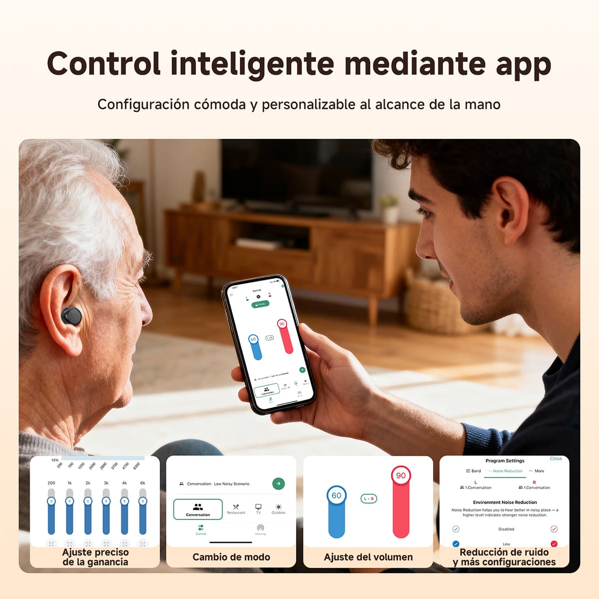 El audífono recargable ofrece un modo general, un modo restaurante, un modo TV y un modo exterior. El modo general es ideal para el uso diario; el modo restaurante es ideal para conversaciones concentradas; el modo TV ofrece un audio nítido; y el modo exterior reduce el ruido del viento. La función de memoria automática restaura automáticamente la configuración del último apagado al encenderlo, lo que simplifica su uso.