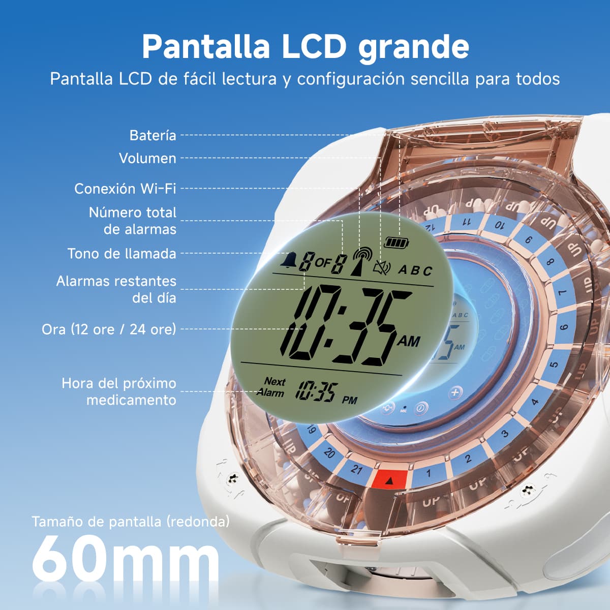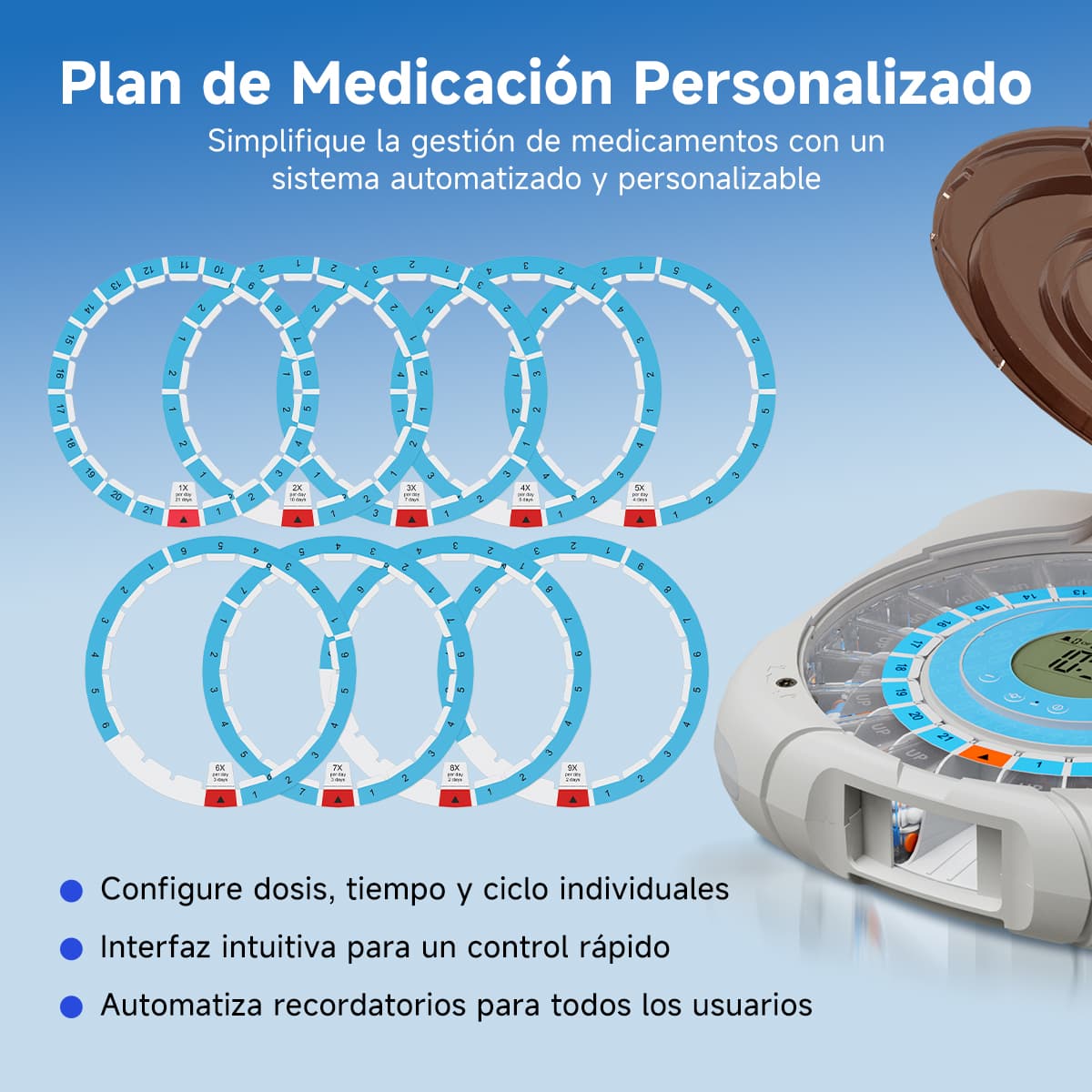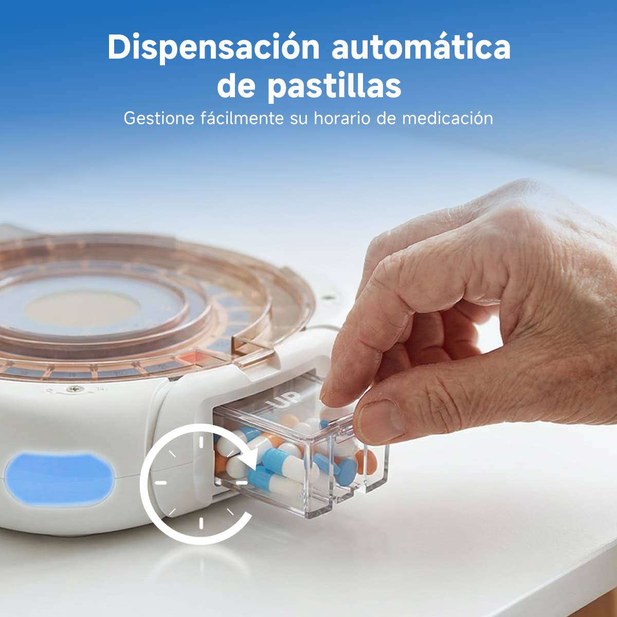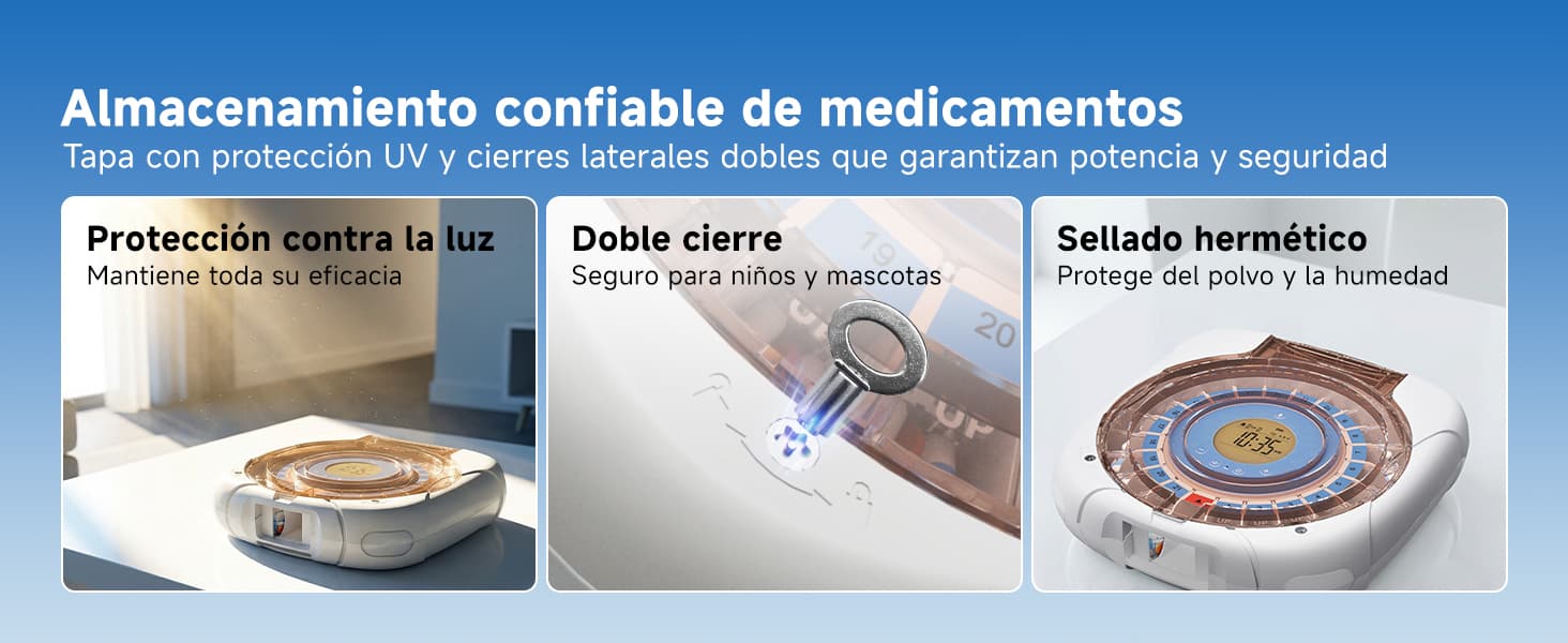 Indicación luminosa: La luz azul parpadea al dispensar pastillas; la luz roja parpadea si no se toman las pastillas después del tiempo de espera