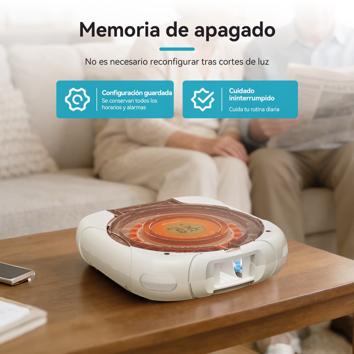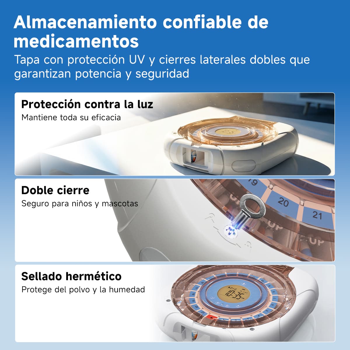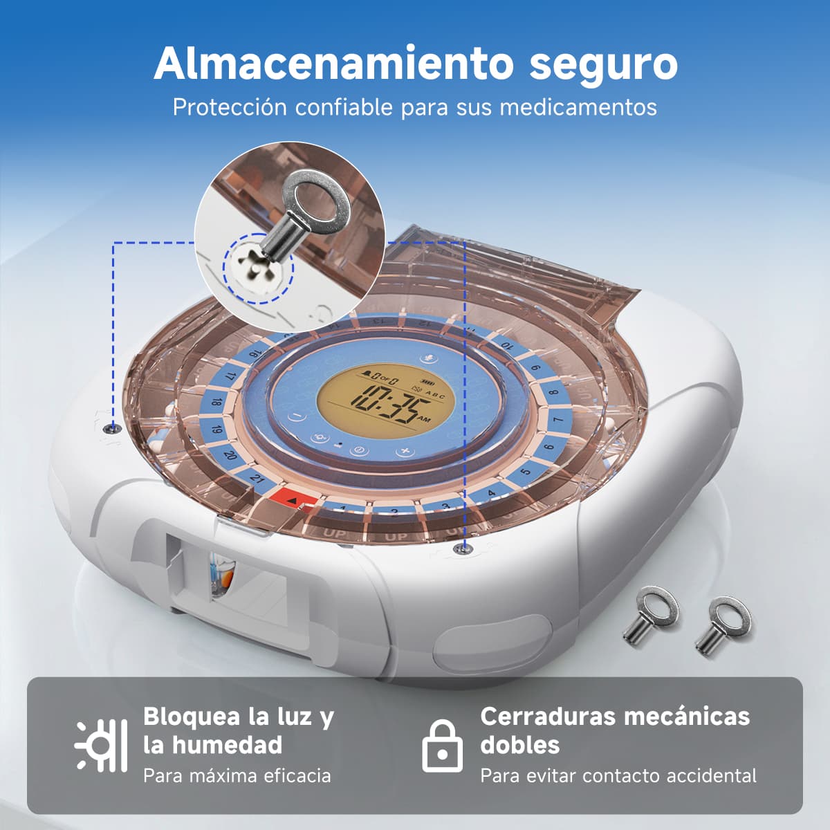 Indicación luminosa: La luz azul parpadea al dispensar pastillas; la luz roja parpadea si no se toman las pastillas después del tiempo de espera