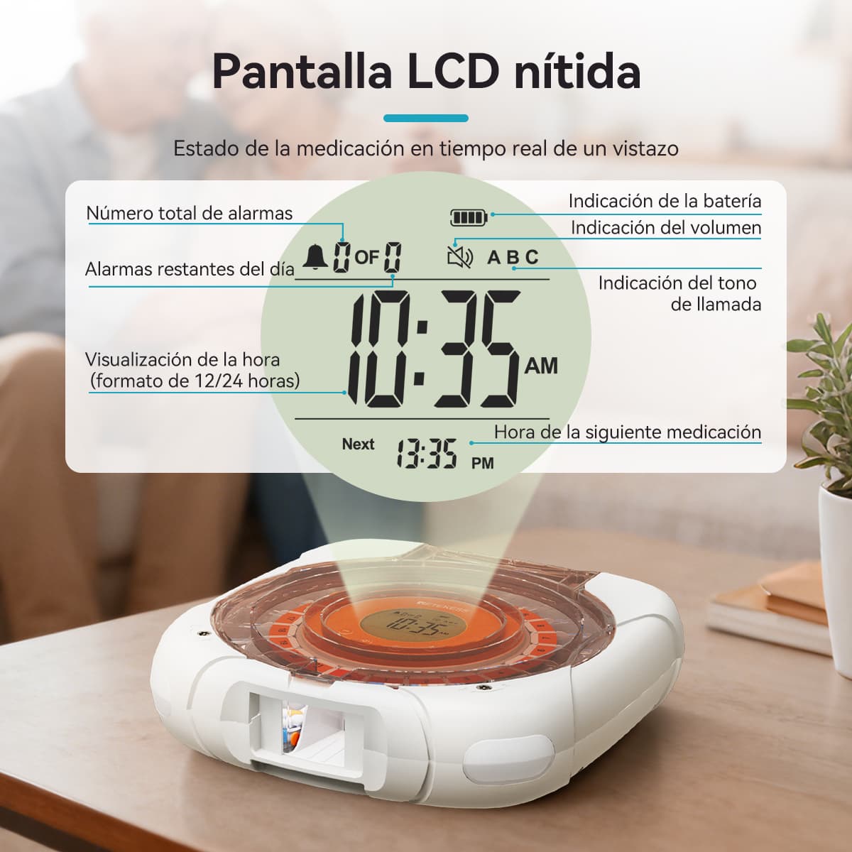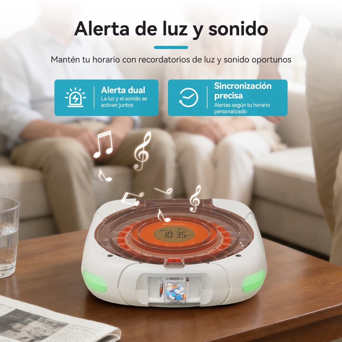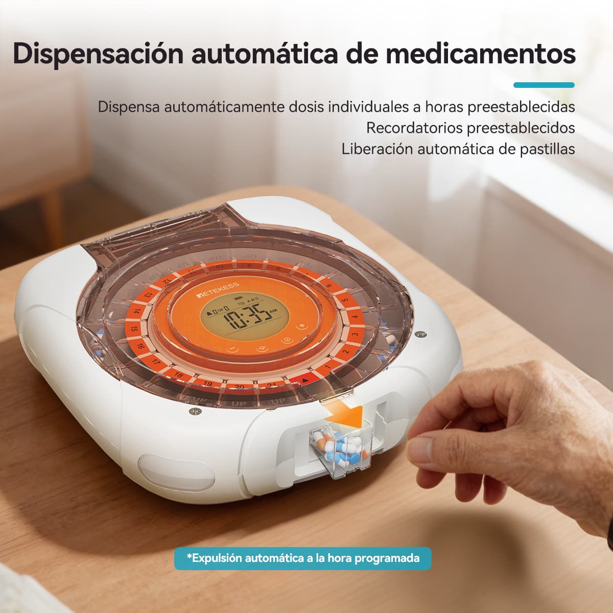 Indicación luminosa: La luz verde parpadea al dispensar pastillas; la luz roja parpadea si no se toman las pastillas después del tiempo de espera