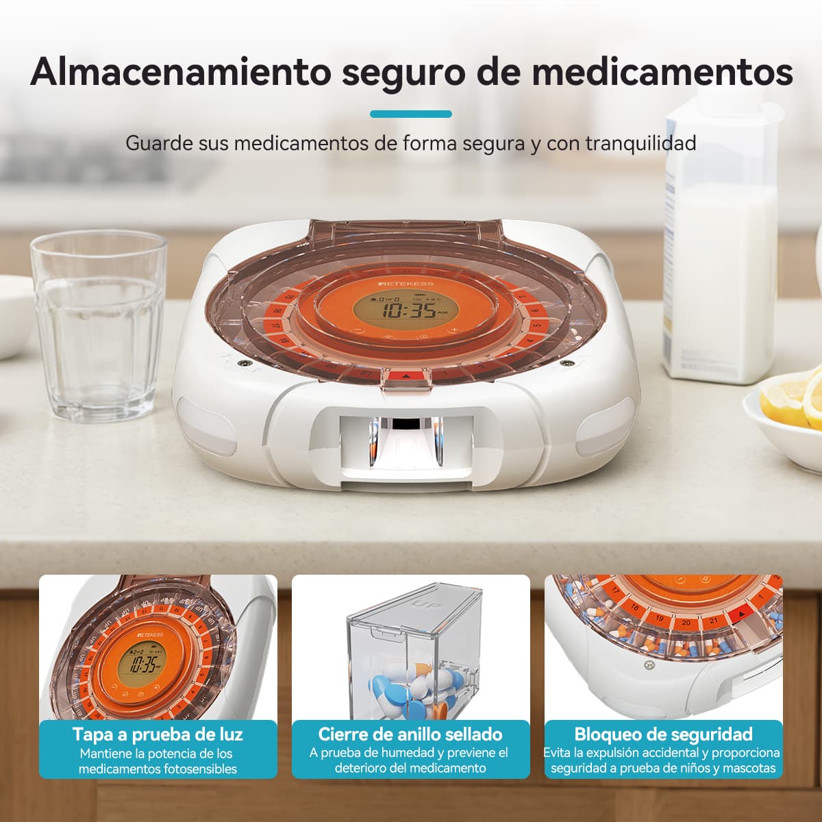 Con un cierre de estructura mecánica, los compartimentos de pastillas quedan totalmente asegurados cuando no están en uso, eliminando por completo el riesgo de acceso accidental o confusión de medicamentos. No es necesario inclinar el pastillero para extraer las pastillas: el compartimento correspondiente se abre automáticamente con un suave toque, haciendo la operación sencilla y sin esfuerzo, especialmente para usuarios con destreza manual limitada.