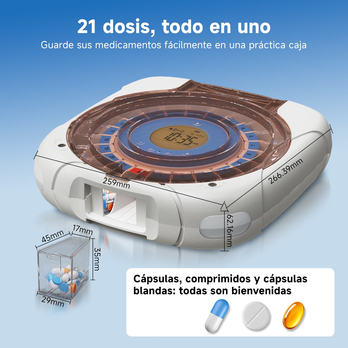 | Unidad principal del pastillero inteligente con WiFi | 1 unidad | Unidad principal del pastillero inteligente independiente | 1 unidad |