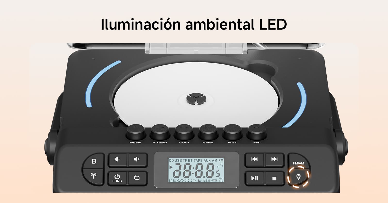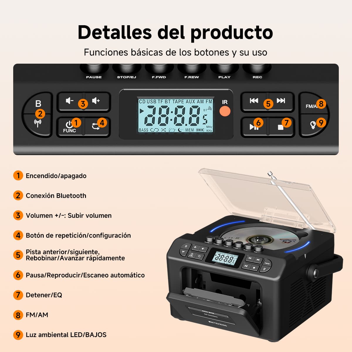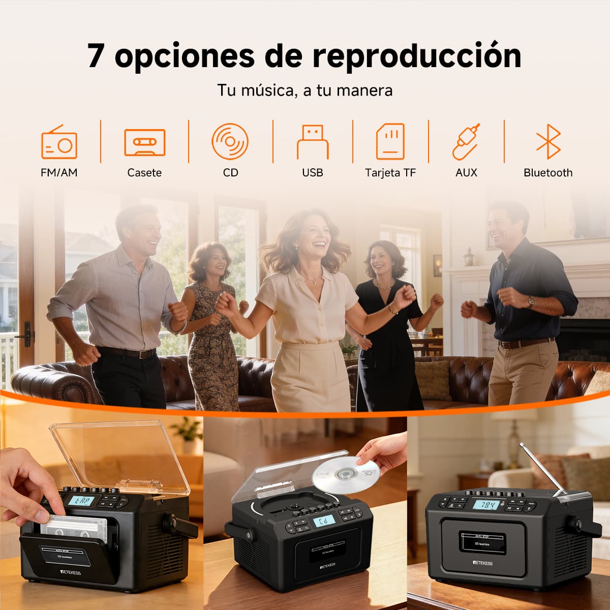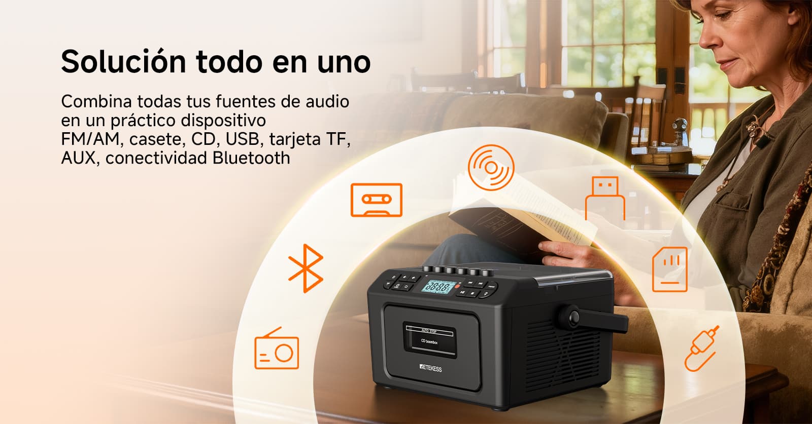Soporta siete modos de reproducción: casete, CD, memoria USB, tarjeta TF, Bluetooth, AUX y FM/AM. Ya sean tus valiosas cintas de música vintage, discos CD clásicos o archivos MP3 en dispositivos digitales modernos, puede reproducirlos sin esfuerzo. La función de casete también permite grabar desde múltiples fuentes como CD, radio y Bluetooth. El diseño anti-borrado protege preciosos recuerdos sonoros, satisfaciendo las necesidades auditivas de diferentes épocas en un solo equipo.