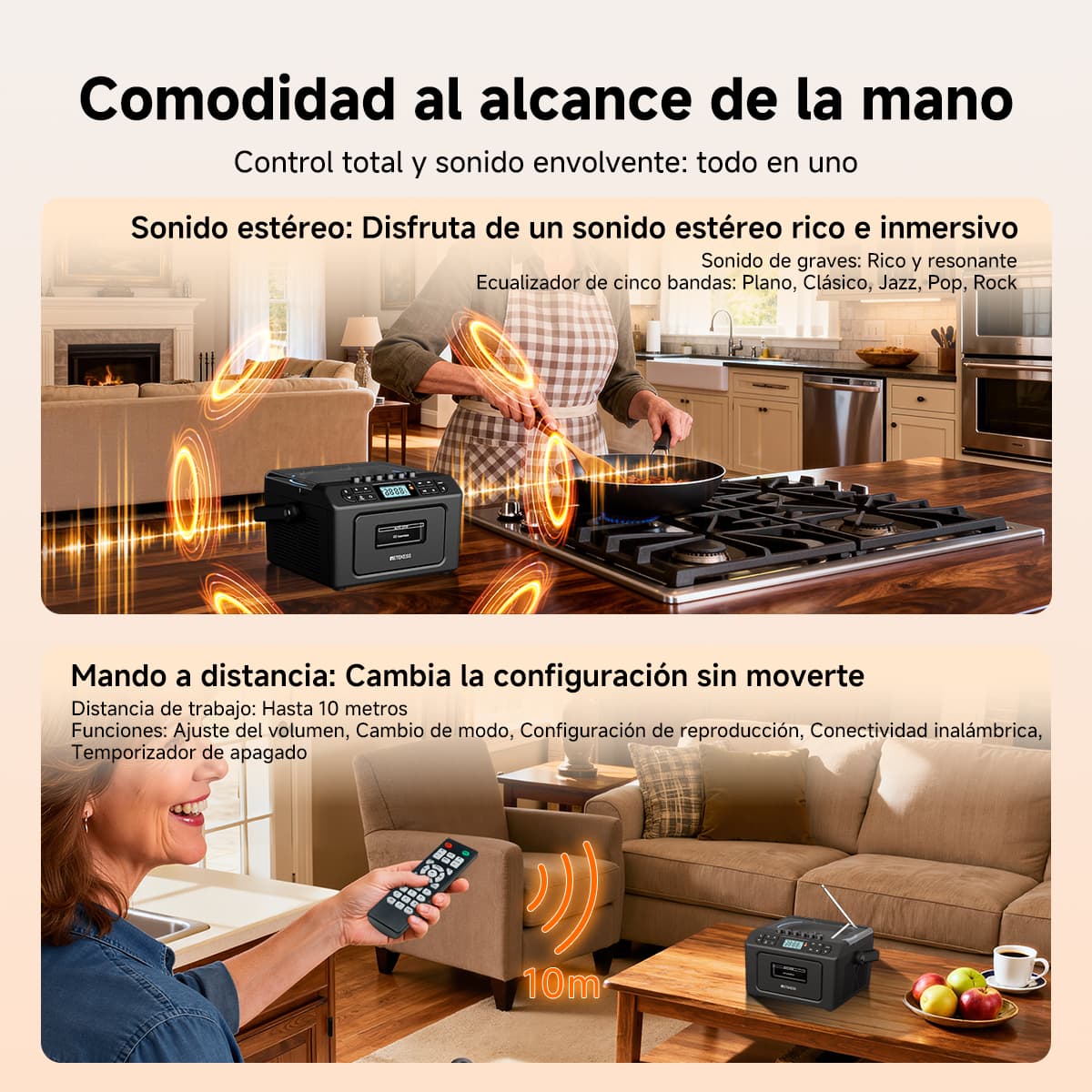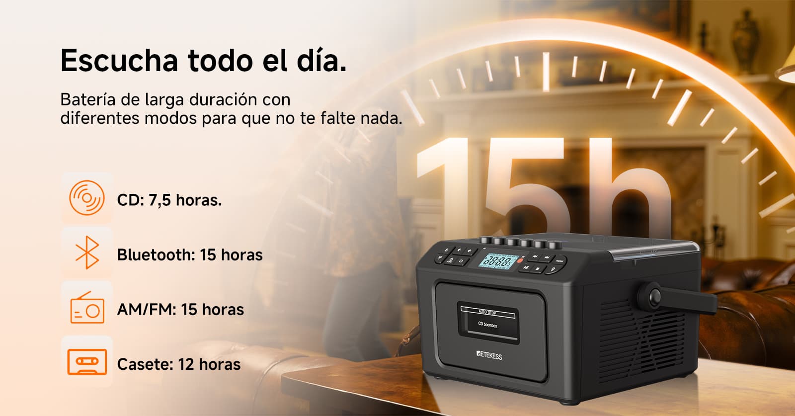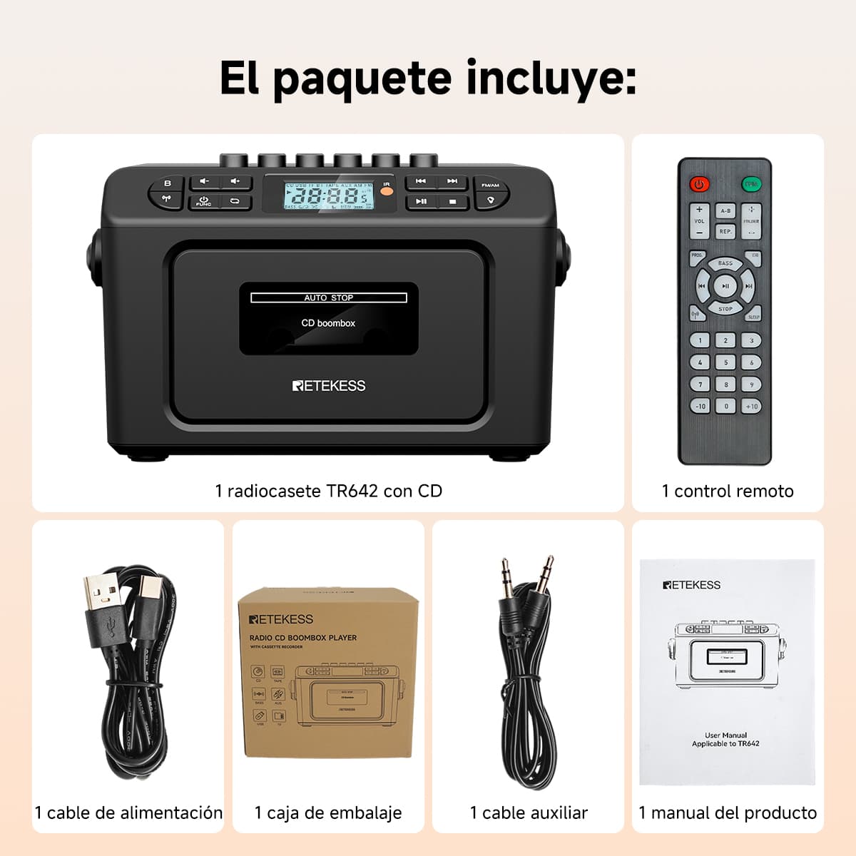 Soporta siete modos de reproducción: casete, CD, memoria USB, tarjeta TF, Bluetooth, AUX y FM/AM. Ya sean tus valiosas cintas de música vintage, discos CD clásicos o archivos MP3 en dispositivos digitales modernos, puede reproducirlos sin esfuerzo. La función de casete también permite grabar desde múltiples fuentes como CD, radio y Bluetooth. El diseño anti-borrado protege preciosos recuerdos sonoros, satisfaciendo las necesidades auditivas de diferentes épocas en un solo equipo.