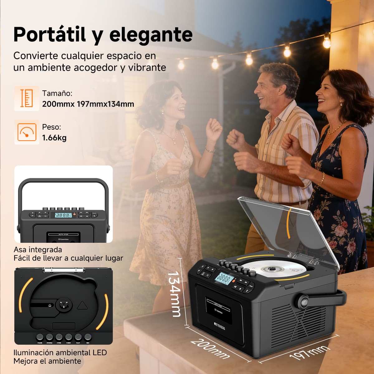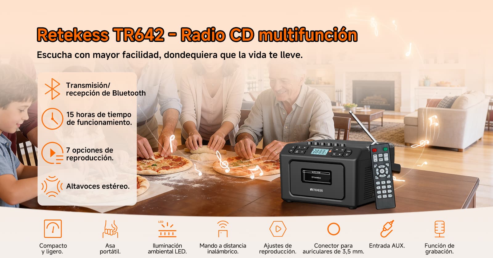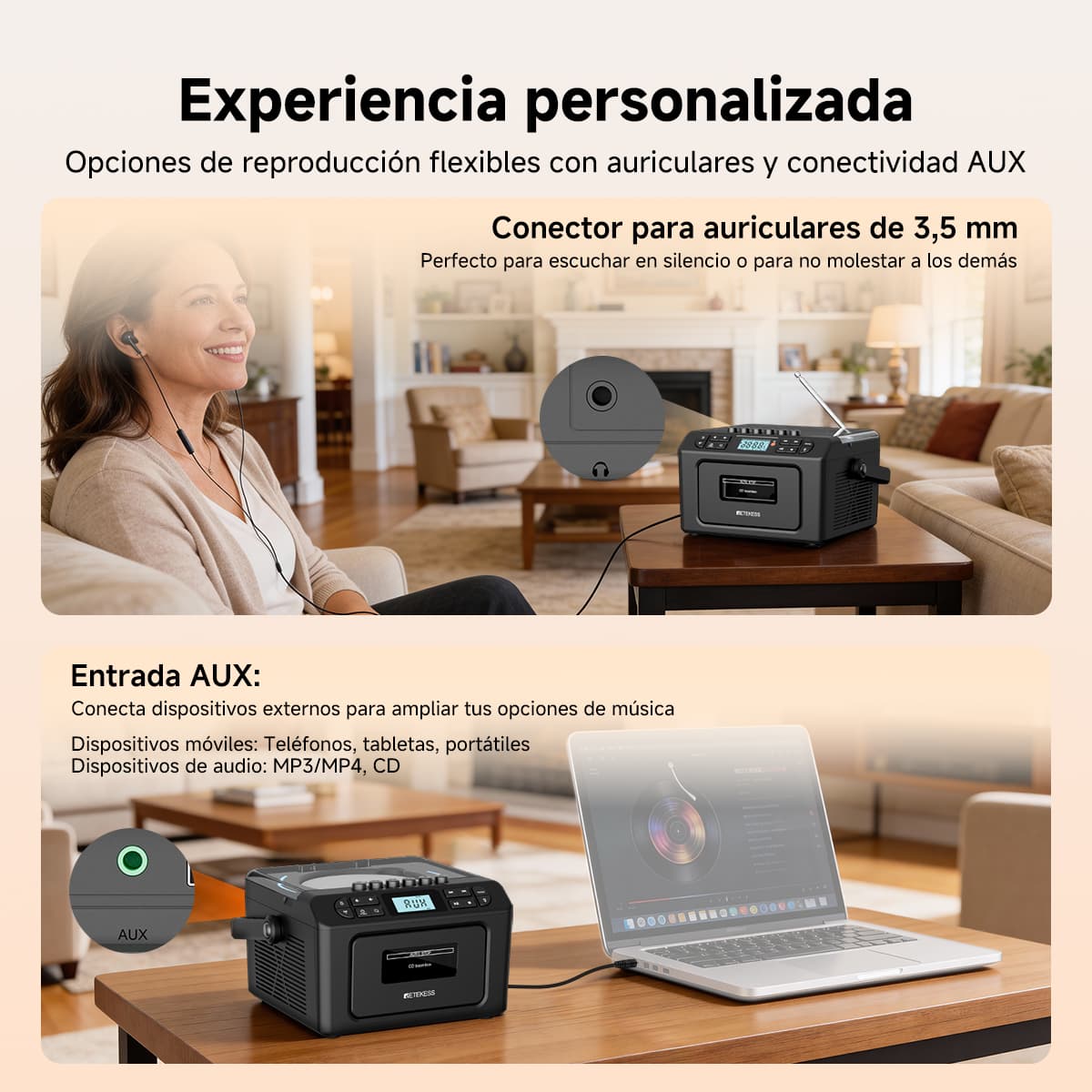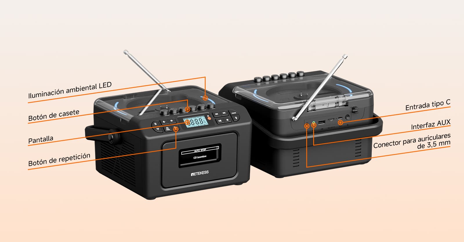 Soporta siete modos de reproducción: casete, CD, memoria USB, tarjeta TF, Bluetooth, AUX y FM/AM. Ya sean tus valiosas cintas de música vintage, discos CD clásicos o archivos MP3 en dispositivos digitales modernos, puede reproducirlos sin esfuerzo. La función de casete también permite grabar desde múltiples fuentes como CD, radio y Bluetooth. El diseño anti-borrado protege preciosos recuerdos sonoros, satisfaciendo las necesidades auditivas de diferentes épocas en un solo equipo.