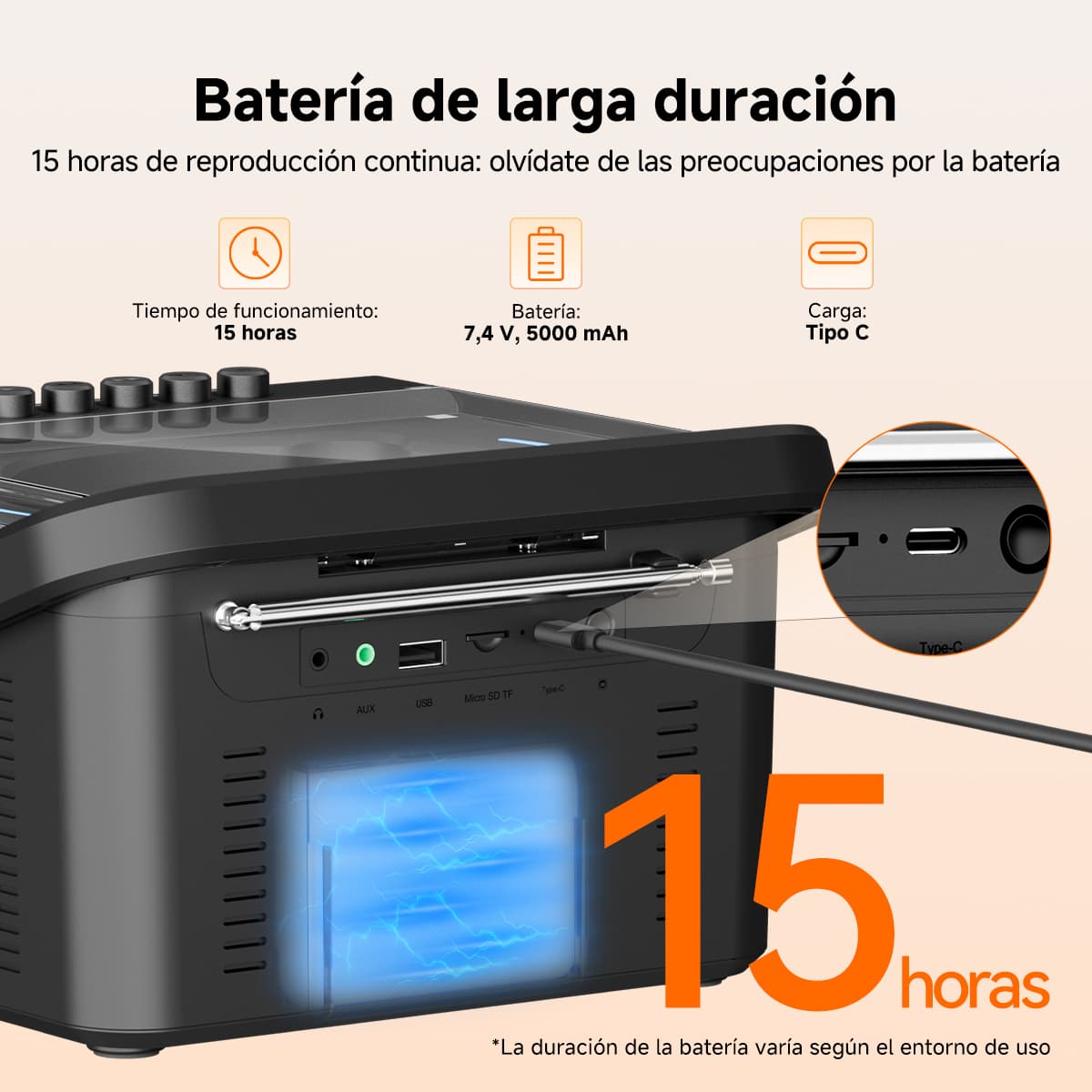 Autonomía y Portabilidad Equilibradas, Uso sin Estrés:Batería incorporada de alta capacidad 7,4V/5000mAh con puerto de carga rápida TYPE-C (5,0V/2A) asegura una larga duración, permitiéndote disfrutar de la música incluso durante campamentos o picnics al aire libre. El diseño integrado de asa facilita el transporte, siendo adecuado tanto para uso doméstico como exterior.