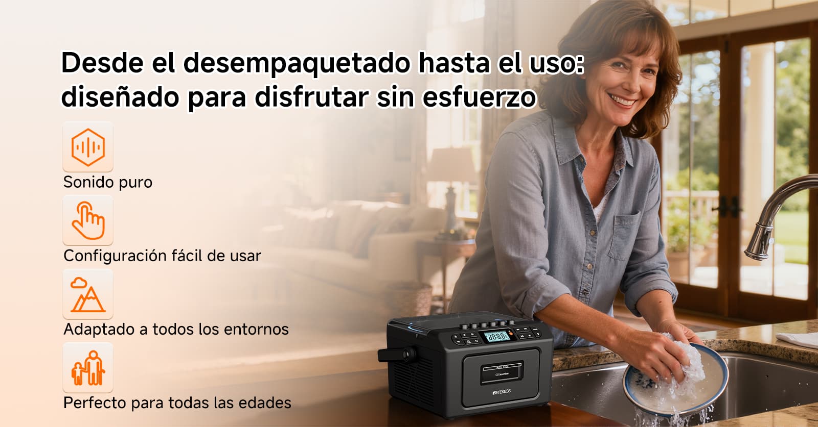 Doble Banda FM/AM con Canales Preestablecidos:Rango de frecuencia FM: 76.0-108 MHz; rango de frecuencia AM: 522-1710 kHz. Puede almacenar hasta 60 emisoras de radio (30 para FM y 30 para AM). Tus canales favoritos de noticias y música pueden activarse con un clic, permitiéndote "mantenerte al día" en cualquier momento y lugar.