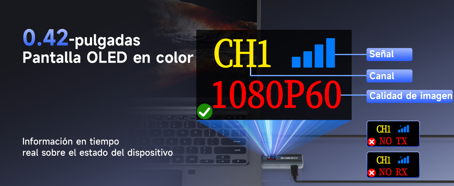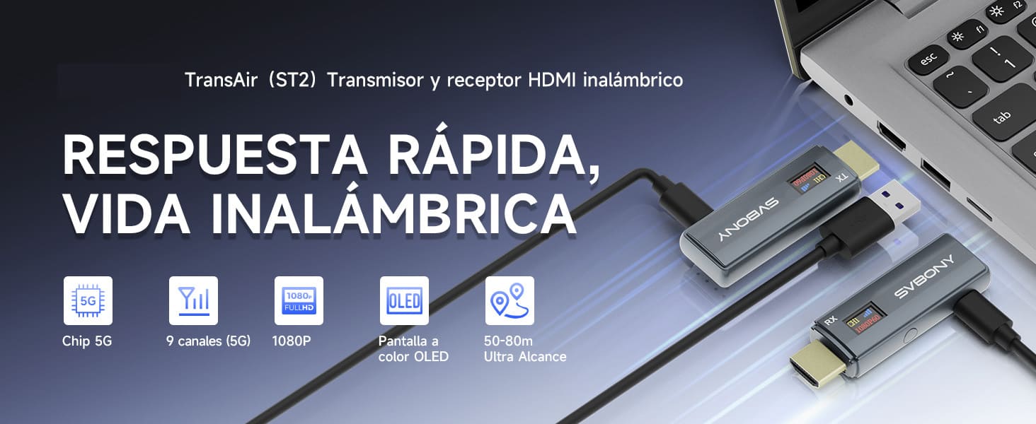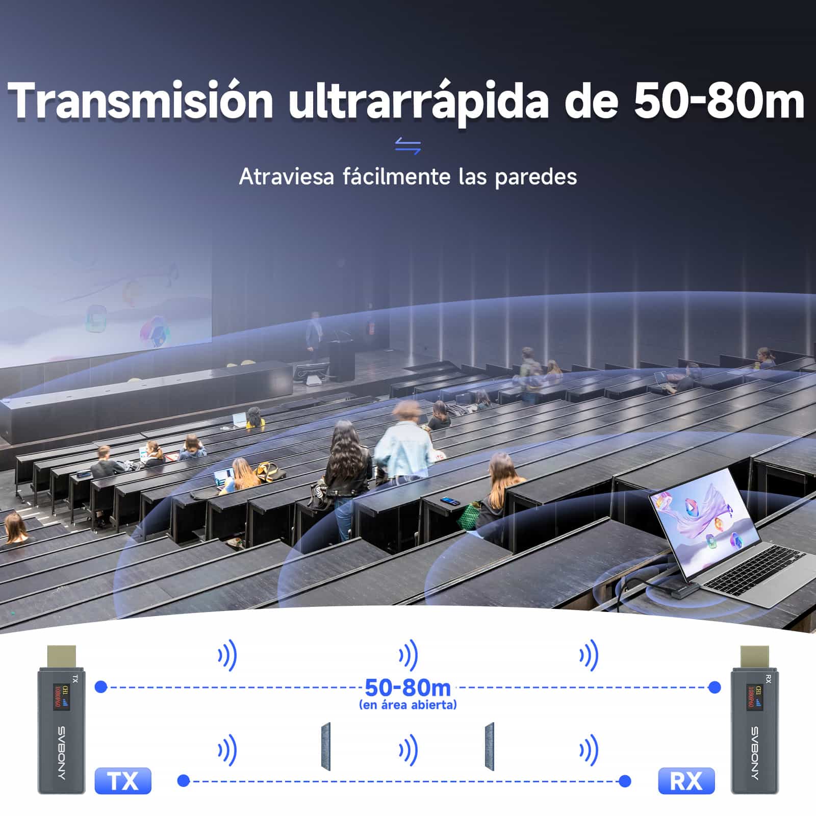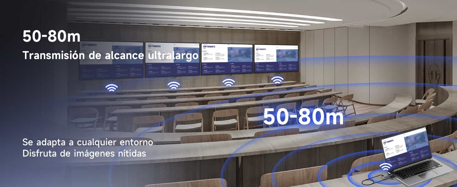 Este dispositivo de transmisión de video inalámbrico está equipado con un chipset de doble banda de 2.4GHz/5GHz, con una distancia de transmisión de hasta 80 metros y la capacidad de atravesar dos paredes. Ofrece una transmisión de señal rápida y estable, ideal para conferencias a larga distancia y grandes eventos al aire libre.