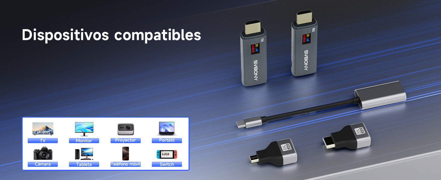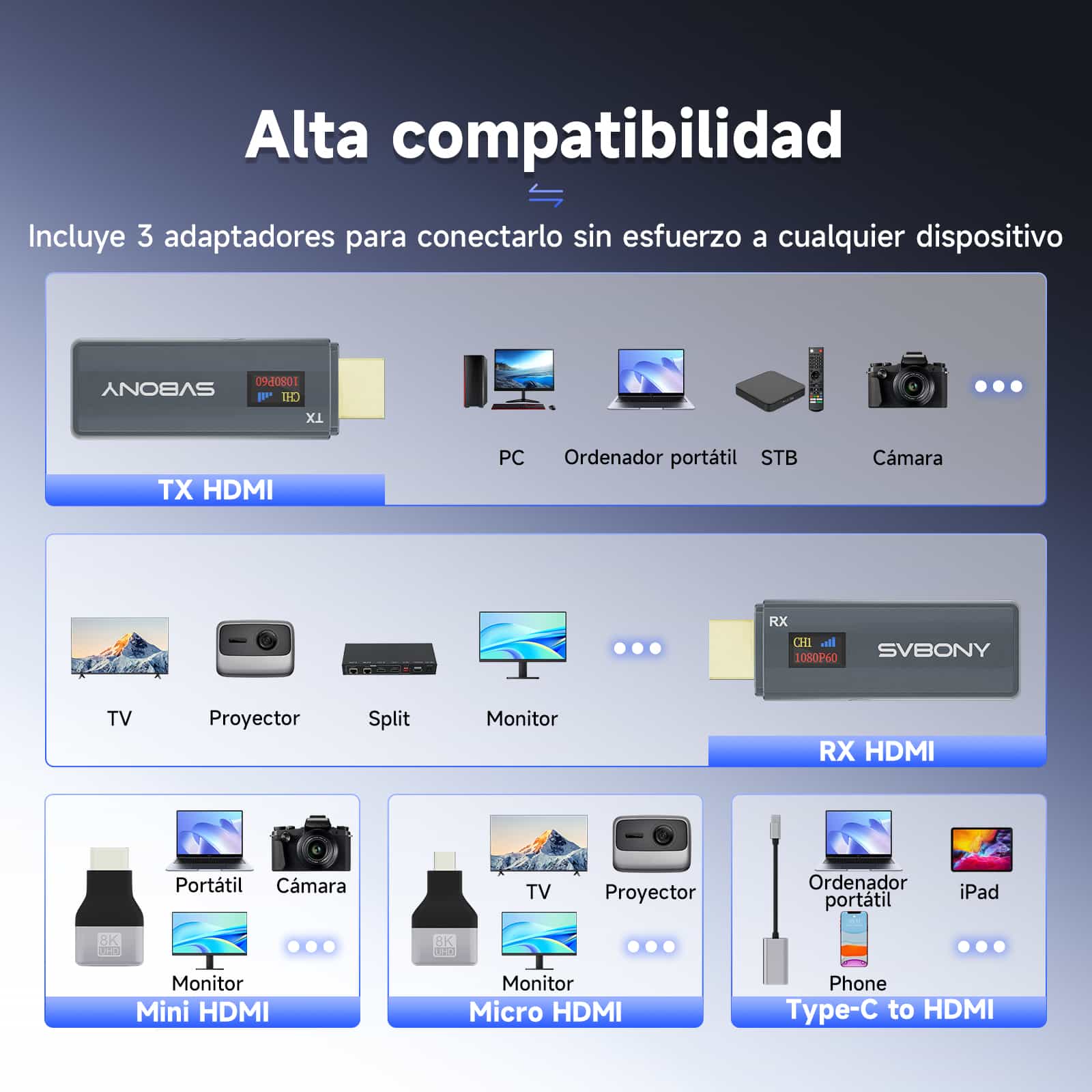 Este sistema transmisor y receptor HDMI inalámbrico incluye tres adaptadores diferentes: un adaptador Mini HDMI, un adaptador Micro HDMI y un cable Tipo-C a HDMI, lo que garantiza una compatibilidad perfecta con una amplia gama de dispositivos como computadoras, televisores, teléfonos inteligentes y cámaras.