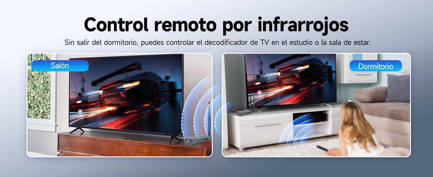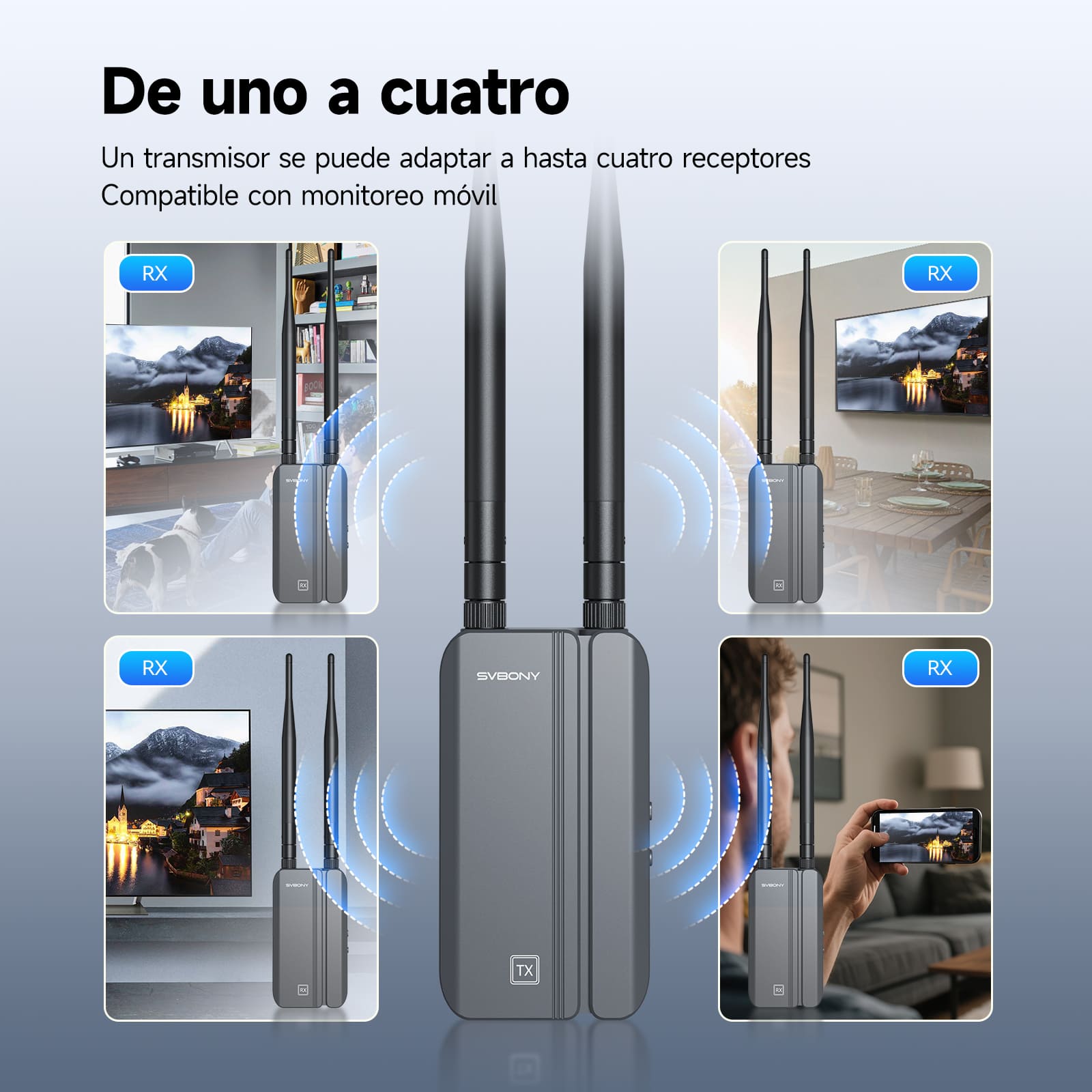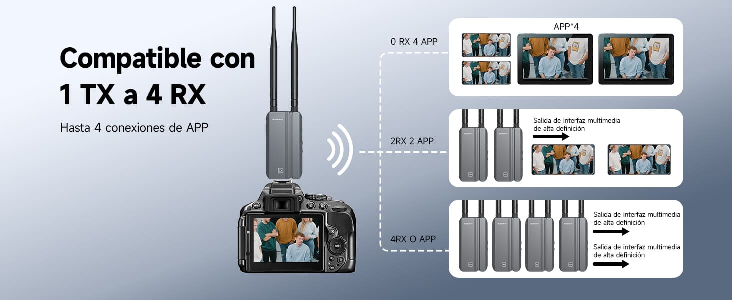 Un transmisor puede conectarse a 1-4 receptores y es compatible con aplicaciones móviles. Puede duplicar imágenes sin problemas desde una sola fuente de señal (como un decodificador) o extender la señal a cuatro dispositivos en cuatro habitaciones.