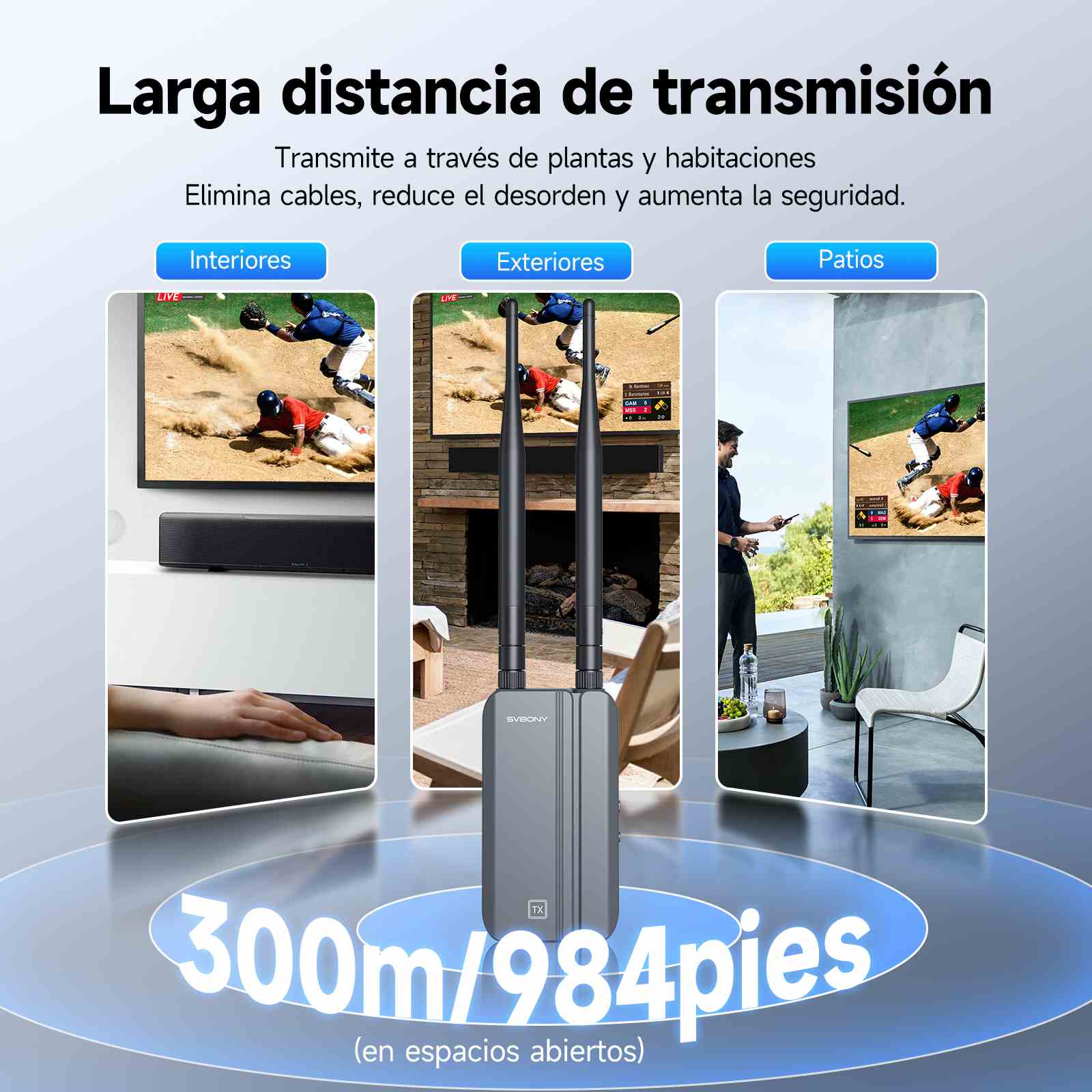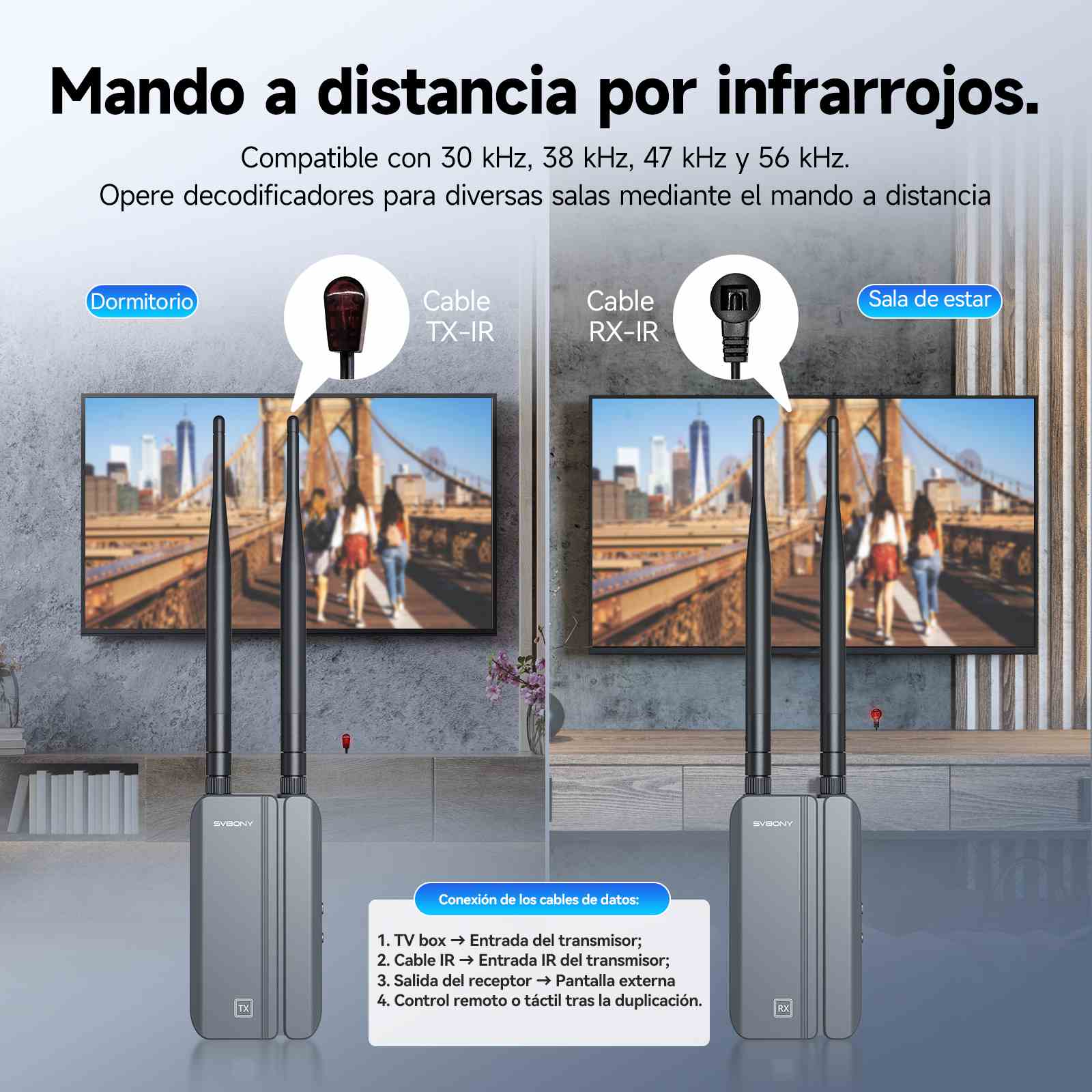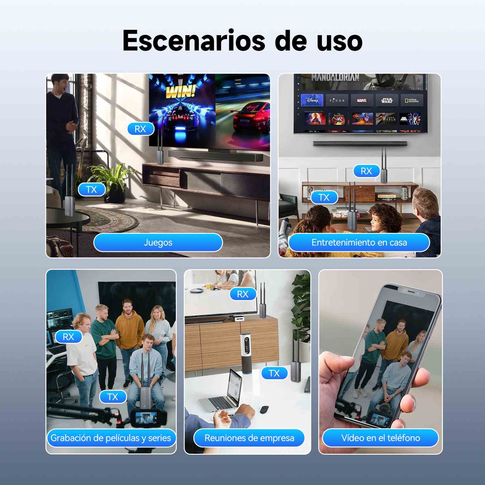 Un transmisor puede conectarse a 1-4 receptores y es compatible con aplicaciones móviles. Puede duplicar imágenes sin problemas desde una sola fuente de señal (como un decodificador) o extender la señal a cuatro dispositivos en cuatro habitaciones.