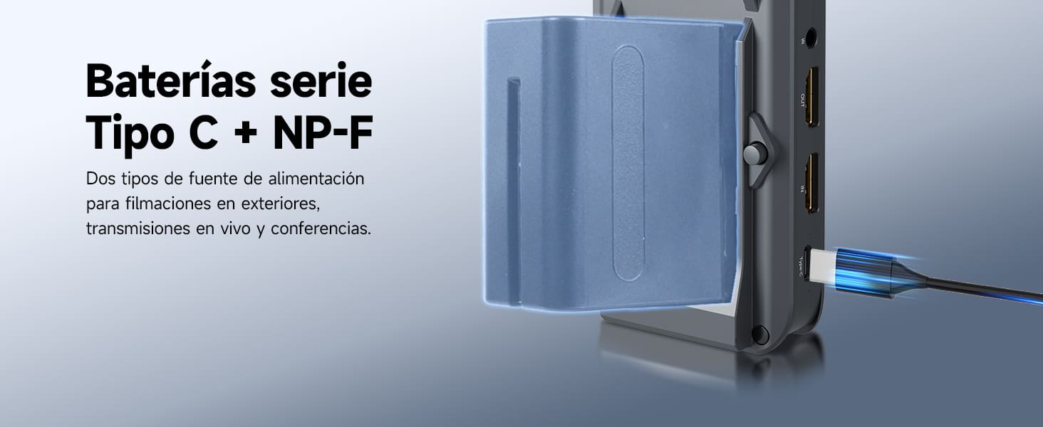 Compatible con interfaz Tipo-C y batería de la serie NP-F, lo que aumenta la portabilidad y la fiabilidad. Alta compatibilidad, diversos escenarios de uso y larga duración de la batería.
